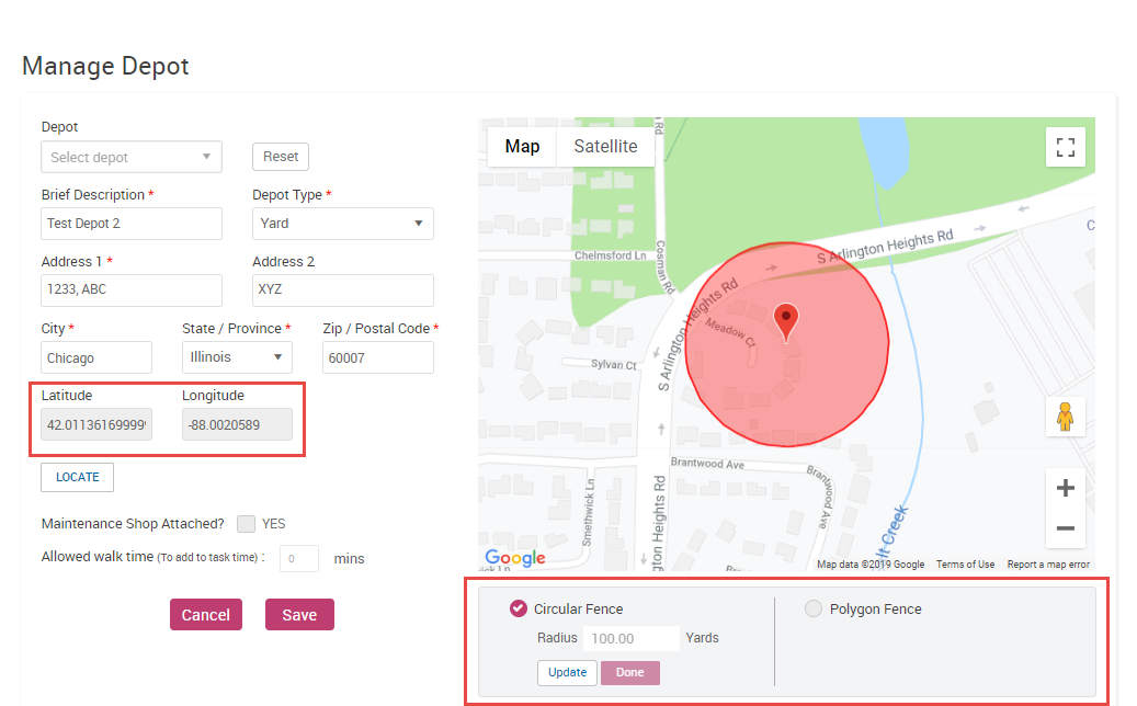 The address of the depot will be marked on the map and the Latitude and Longitude of the address will be picked up automatically by the system and populated in the respective fields.