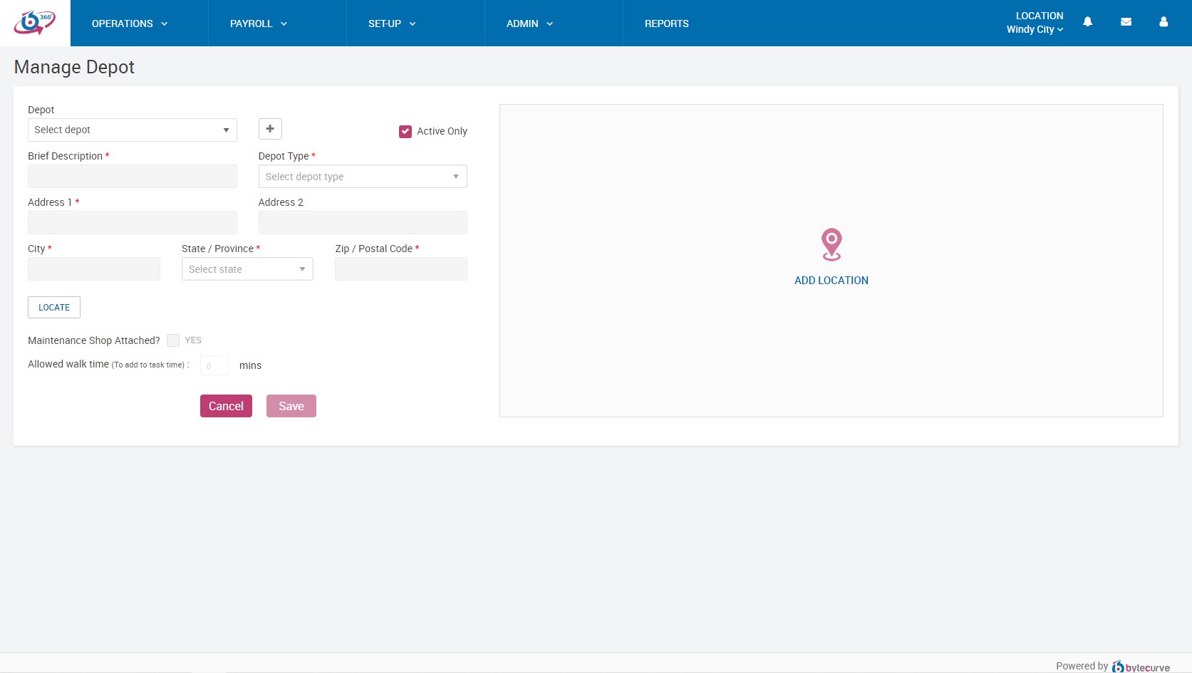 This function allows the user to set-up or modify Depots / Yards and Park-outs. A depot or yard is any location from where vehicles start or terminate when starting or ending a driving task (such as HTS Routes, Charters, Field Trips, etc.).