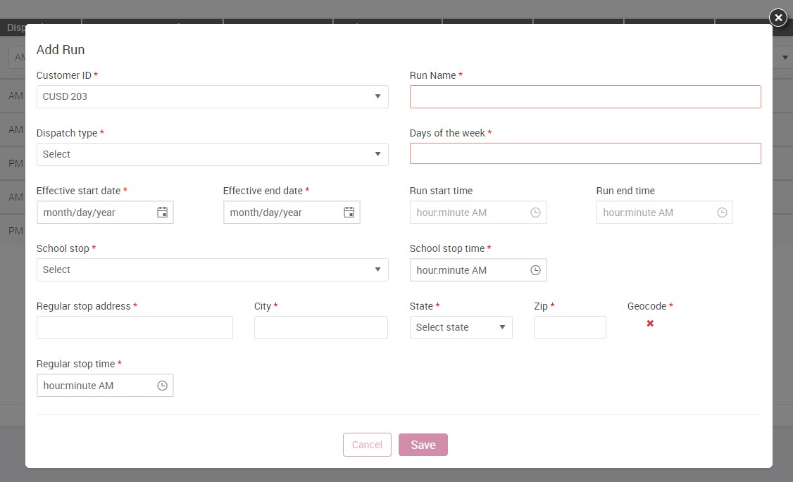 Below is an example of the, "Add Run" screen. Fill out all of the required information and select save.