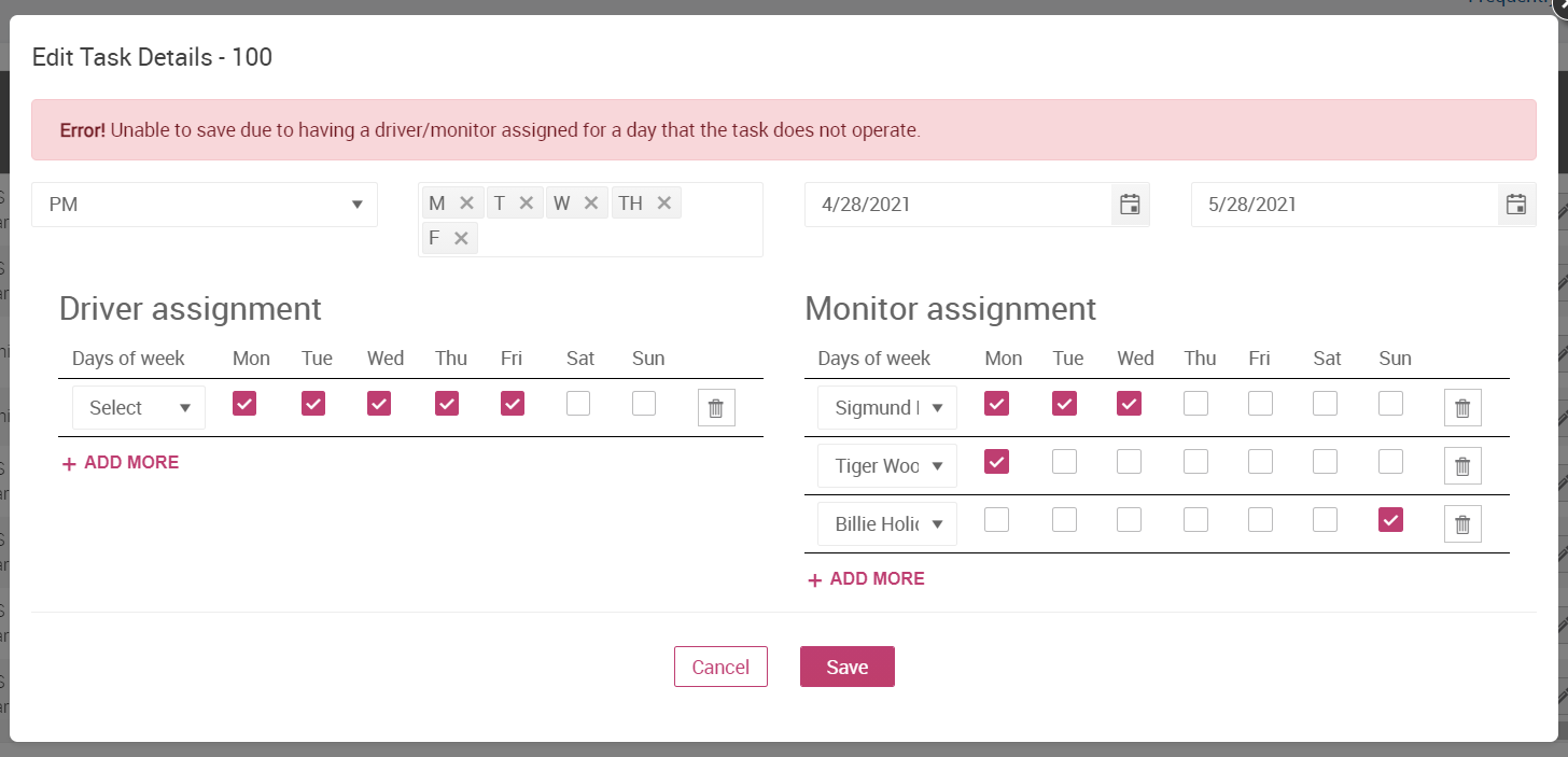 If Task is not performed on selected day (let's say task (route) is for MTW, and you selected Friday), the system will show an error message on Save button: