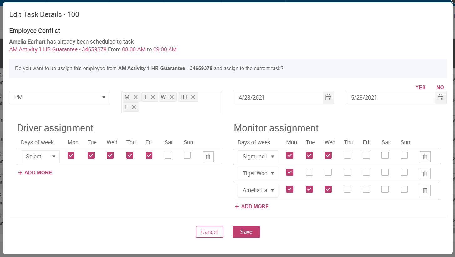 When you select such an Employee, the system will display a conflict error message and prompt you with options on how to proceed. You can un-assign the employee from the conflicting task and assign her/him to this task, or you can pick a different employee for this task.