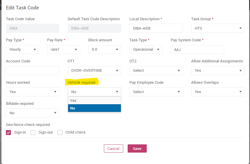 Every task code has the option of requiring a vehicle because a vehicle may not be necessary for the completion of the task as displayed below.