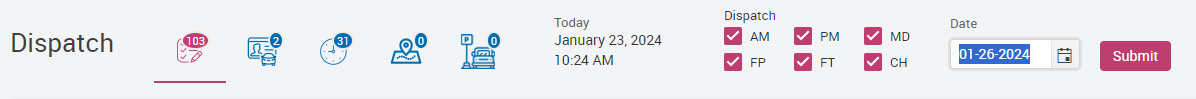 - Select the date for which you wish to perform a mass cancellation and click the submit button to bring up the Dispatch board for the date chosen. This could be today, or it could be a date in the near future.