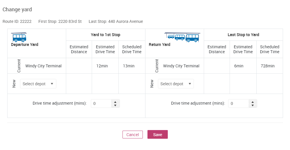 2. This will open the 'Change Yard' screen. You will find two data entry fields titled 'Drive time adjustment (mins)', one to set the drive time adjustment from the departure yard to first stop of the route, and the other, to set the adjustment for the drive time from the last stop of the route to the return yard.