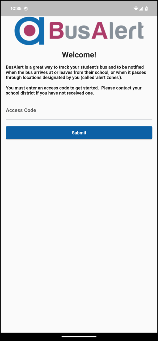 - After you download and launch the app, you will be prompted to enter the 'Access code'. This code is unique to the school district your student attends and will be provided to you by the district. Please note, support staff are not able to provide this to you.