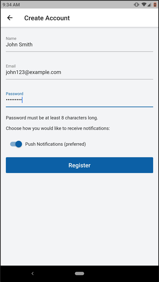 - If you choose to use your email address, click on 'Sign up with email' and enter the details as below. Make sure you leave the 'Push Notifications' toggle 'ON'.