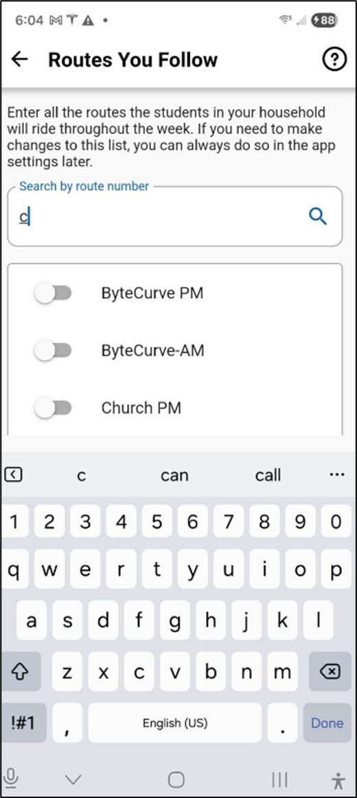 - You can search for your student's route by entering a few characters of the bus identifier in the search box and then select from the filtered shortlist that is displayed. Make sure you select all the buses that all your students ride by swiping the selector toggle button to the right, as shown below.