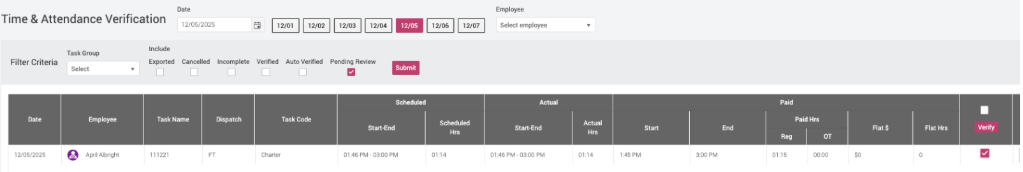 Once all task-assignments are marked as “Verified”, the system sends the trip to busHive