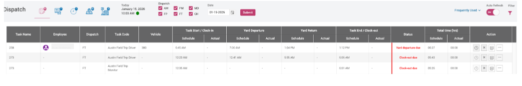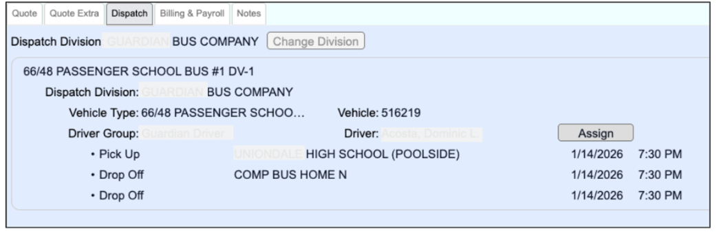 - Assign vehicles and personnel (drivers, monitors, etc.) in the Dispatch tab