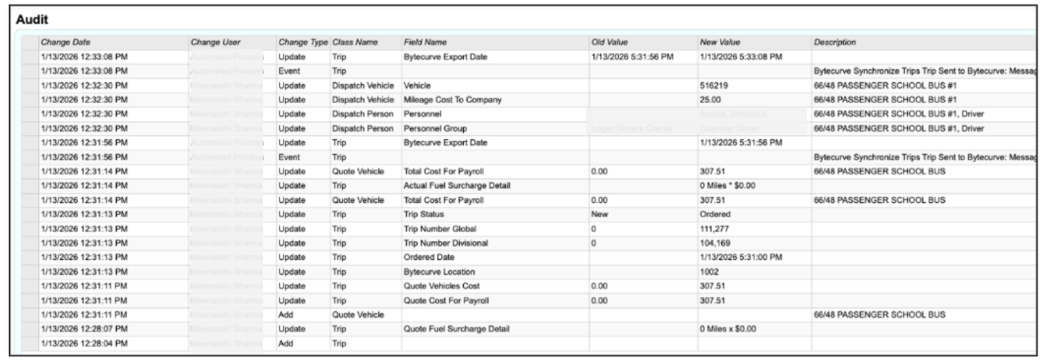 - Confirm trip has been synced with Bytecurve. View the audit log in busHive for confirmation.